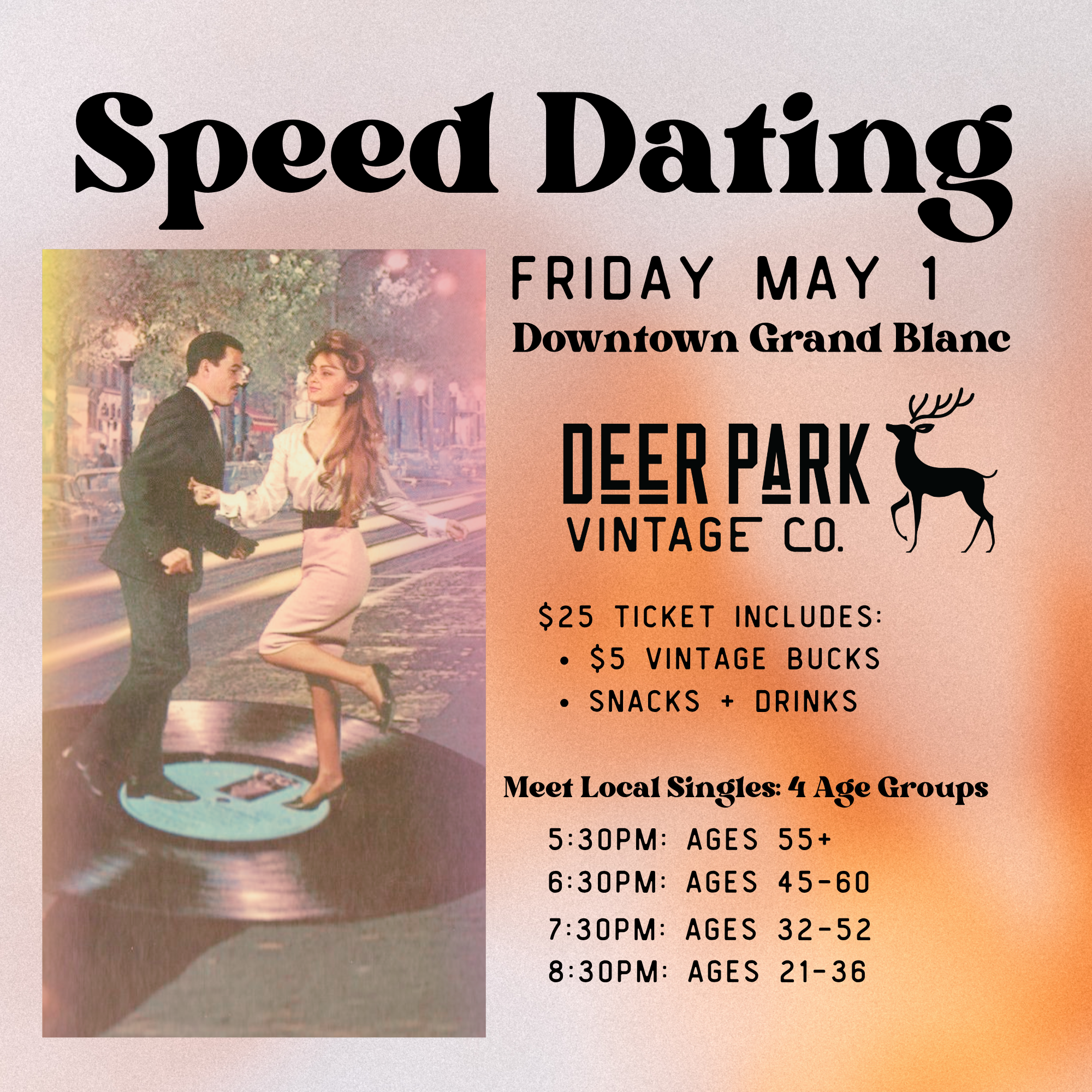 Join us for Speed Dating Night at Deer Park Vintage Co., a social experience designed for local singles who want to meet new people in a relaxed, non-bar setting.